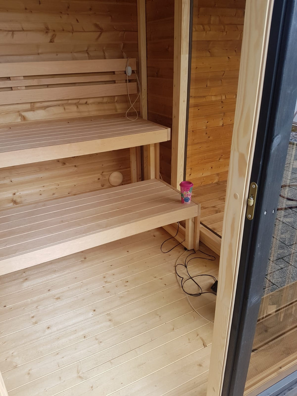 Crafted from Thermally modified Spruce, the Patio S Plus Outdoor Sauna Cabin Kits are durable and weather-resistant. They come with a choice of either a wood-burning or electric stove, a ventilation system, and comfortable benches made from Alder wood. The Patio S Plus model has a unique “L” shaped bench for extra versatility and comfort during use. Additionally, this unit features a stunning panoramic window view with two glass fronts, offering an unobstructed view of the surrounding environment. The open area is ideal for having an outdoor hot tub, cold tub, or sitting area.