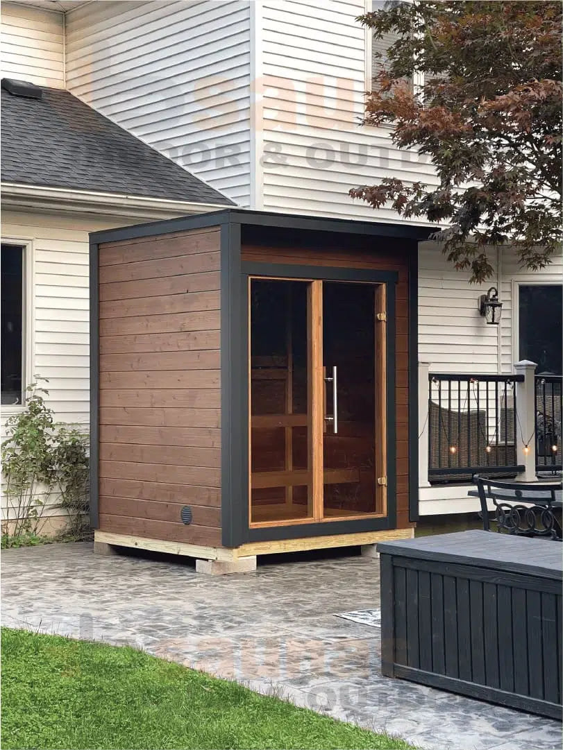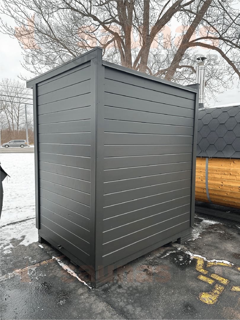 Patio XXS outdoor prefab sauna is typically installed in a backyard or any other outdoor space in the USA. “Prefab”, or “prefabricated” saunas are manufactured in sections/parts, and shipped to the installation site in a nicely packaged crate. The word “prefabricated” refers to factory-made components that are pre-made, and ready to be assembled according to an instruction manual. This makes these saunas much easier to install than traditional saunas.