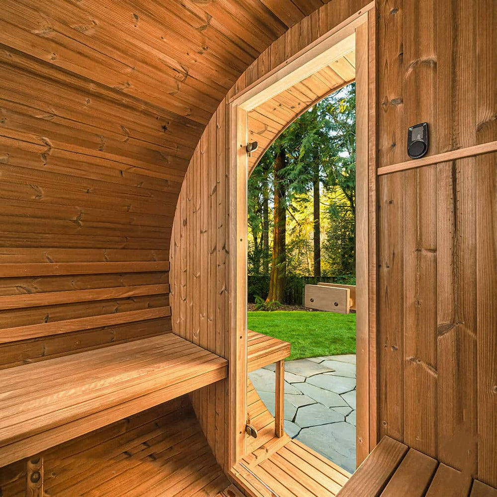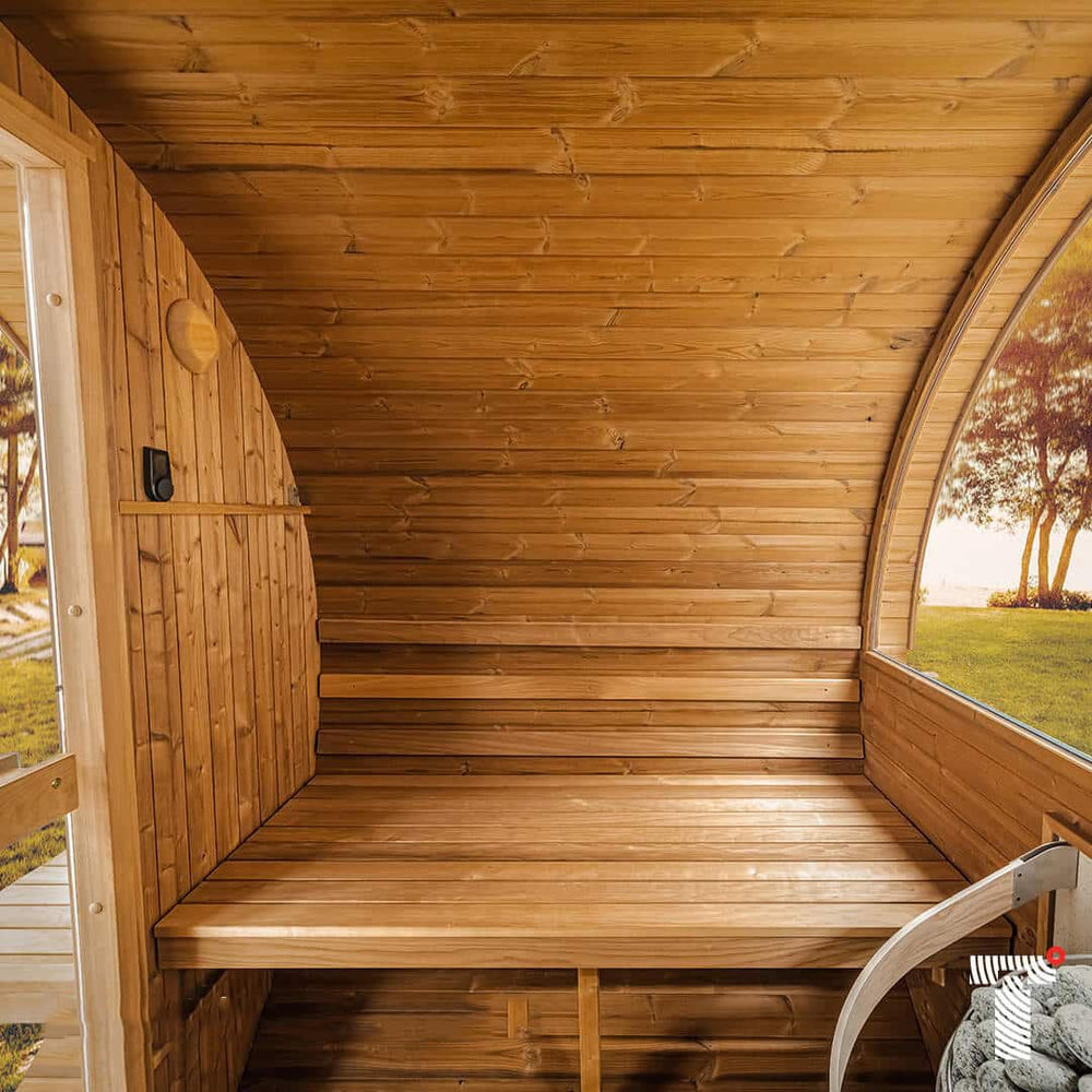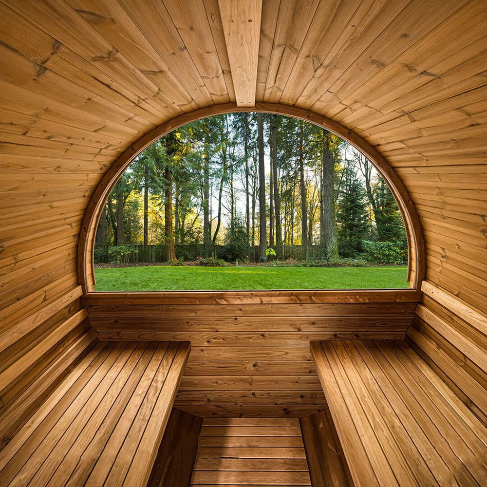 6-person, premium-quality DIY Barrel Sauna Kit with panoramic window. Natural light from the glass door and panoramic window illuminate this beautiful space. Includes comfortable benches for added convenience. Quality materials and superb engineering make this the very best outdoor sauna.