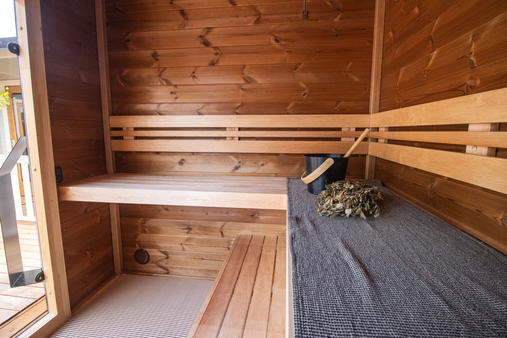 Crafted from Thermally modified Spruce, the Patio S Plus Outdoor Sauna Cabin Kits are durable and weather-resistant. They come with a choice of either a wood-burning or electric stove, a ventilation system, and comfortable benches made from Alder wood. The Patio S Plus model has a unique “L” shaped bench for extra versatility and comfort during use. Additionally, this unit features a stunning panoramic window view with two glass fronts, offering an unobstructed view of the surrounding environment. The open area is ideal for having an outdoor hot tub, cold tub, or sitting area.