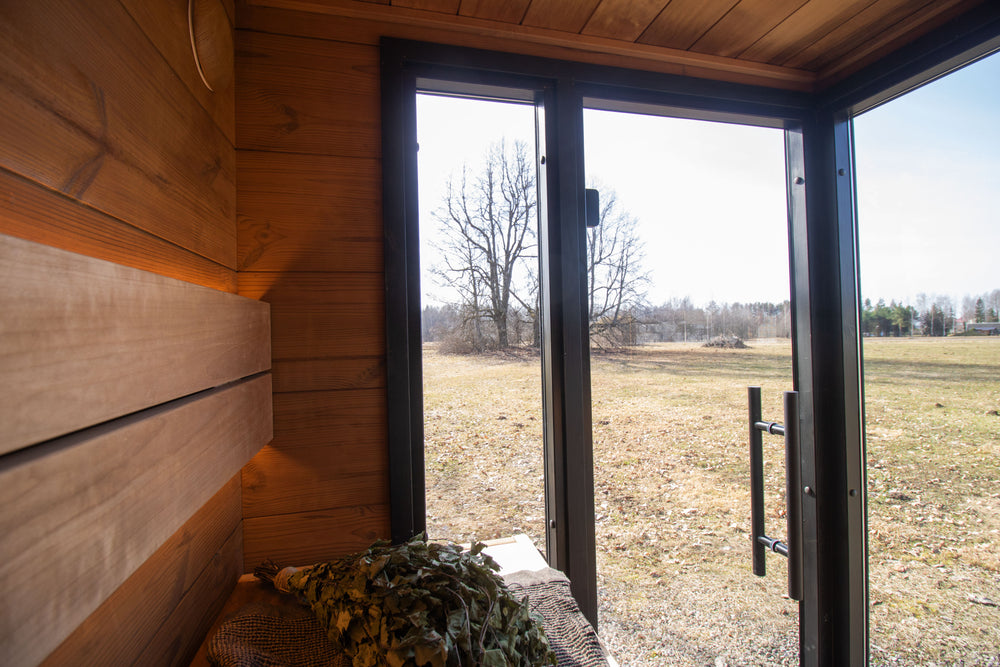 The sauna doors and windows are grey double-tempered glass, ensuring durability even in extreme temperature changes. The sauna door is equipped with a premium black door hinges and black handle.